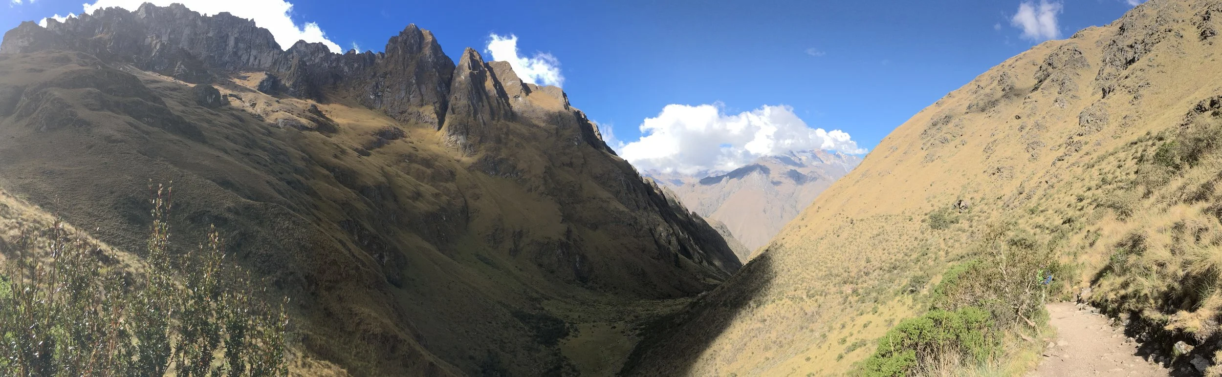 After a welcome and congratulatory break at the top of Dead Woman, we put our warm jackets on and started the descent to our next stop for the night, our small group scattered on the trail. John and I took our time. The steep stone steps wound their way down the wildly beautiful Andean mountains surrounded and dwarfed by snowcapped peaks. Painted across the blue skies, the forest of clouds hovered over the majestic scenery. Silence was as pure as the air.
